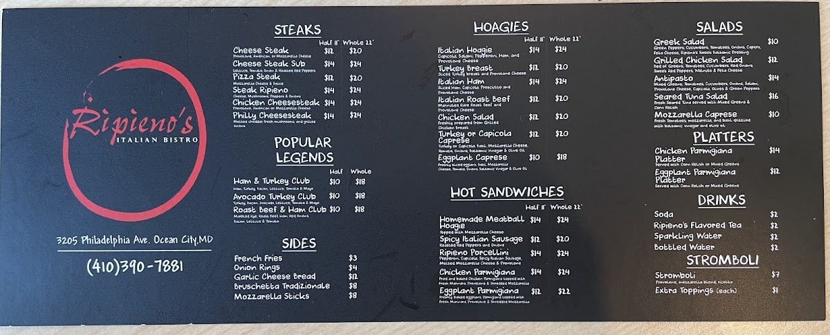 Ripieno's Italian Bistro offers a straightforward and inviting menu that focuses on comforting Italian classics and satisfying casual bites. Whether you're stopping in for a relaxed lunch or a cozy dinner, the menu is designed to complement the friendly, laid-back atmosphere of this Ocean City spot.