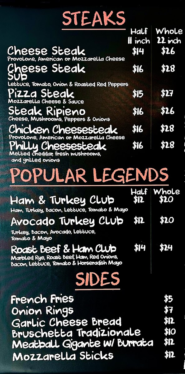Guests can enjoy wood-fired pizzas like the Margherita or the more hearty 28-inch half-and-half options alongside fresh salads and generous hoagies. The lineup also includes a variety of cheesesteaks and sandwiches, providing familiar flavors that pair well with either a family meal or a catch-up with friends.